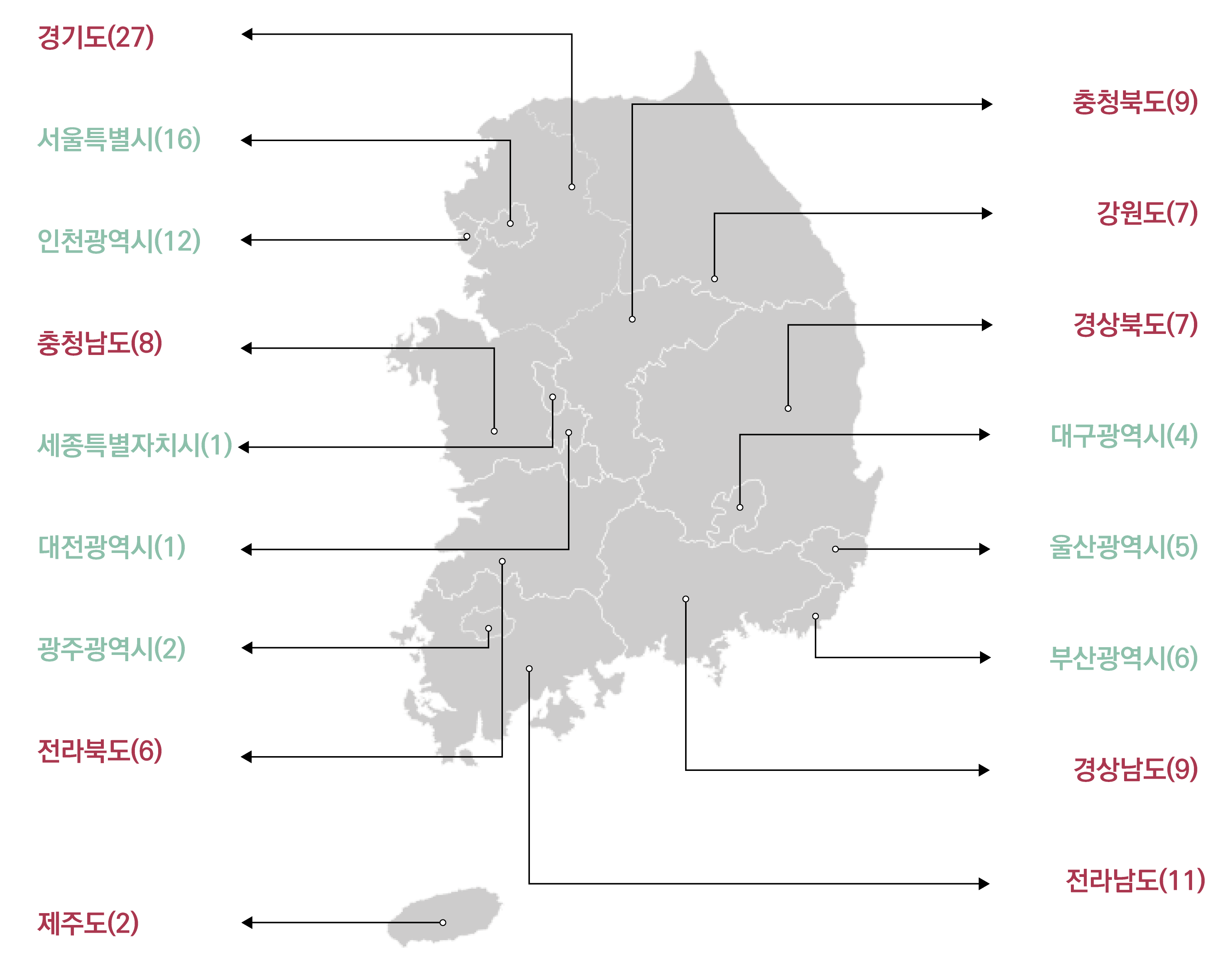 총 135개 : 광역 18개, 기초 117개 (2022년 11월 2일 기준)
