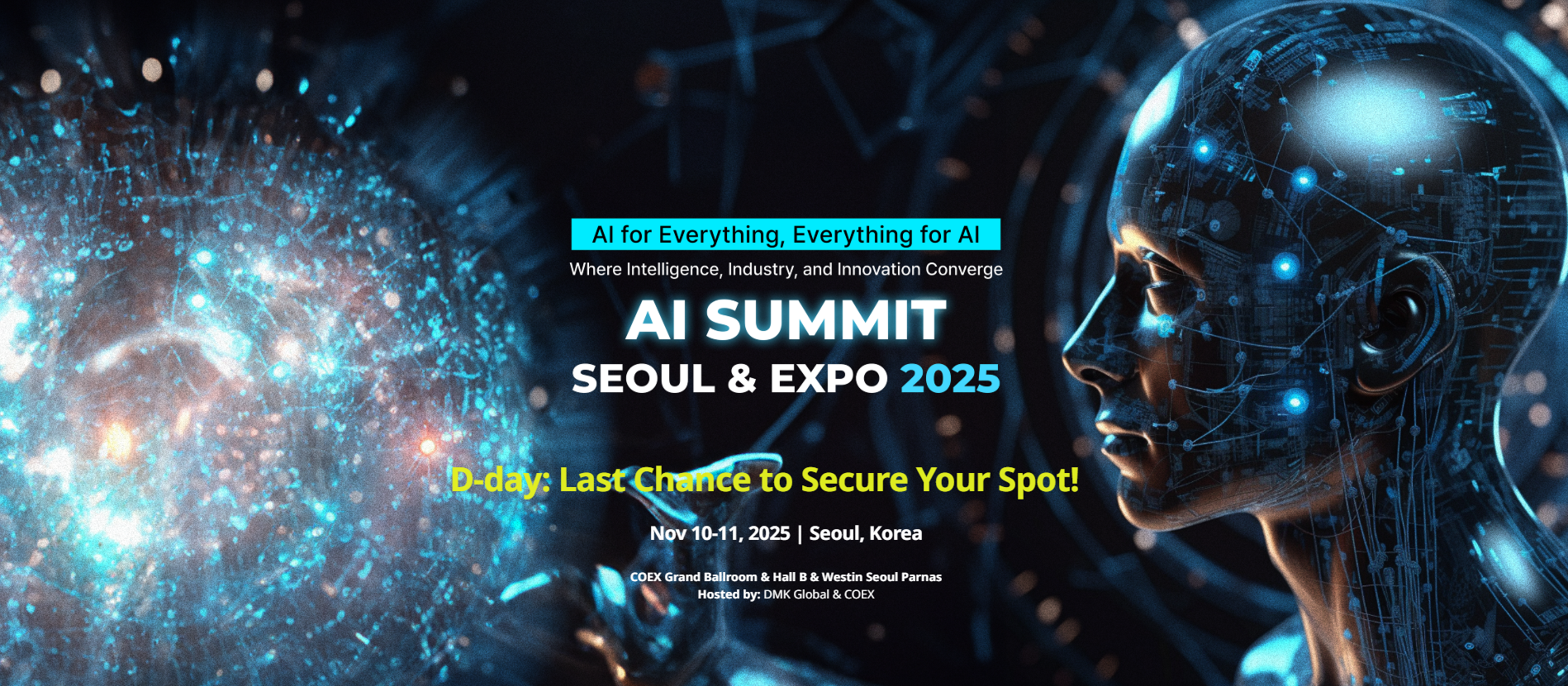 AI SUMMIT SEOUL & EXPO 2025 8th AI Summit Seoul & Expo 일시/장소 : 2025년 11월 10일(월) ~11월11일(화) 장소 : 코엑스 후원/주관 : 서울시 / DMK Global 주 제 : AI for Everything, Everything for AI 홈페이지 바로가기 + Add to Google Calendar + iCal / Outlook export The event is finished. Date 2025.11.10 - 11 Expired! Time All Day Category 엑스포 Share this event