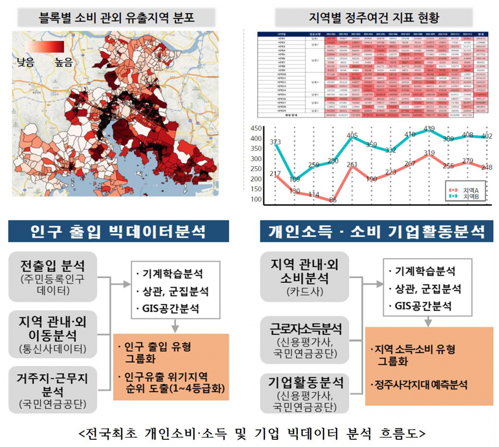 분석 활용 데이터는 구체성과 최신성이 높고, 자료의 갱신주기가 빠른 국민연금공단, 통신사, 카드사, 기업신용평가사 등의 외부 빅데이터와 주민등록·전출입데이터 등 행정 빅데이터를 융·복합하여 분석하게 된다.
