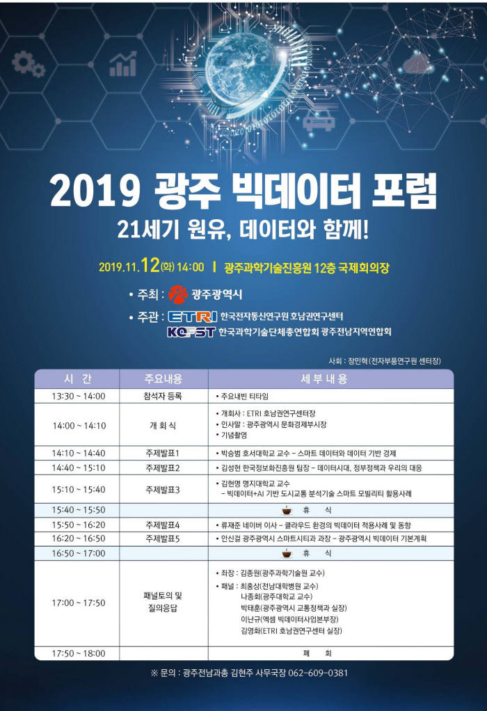 광주광역시는 12일 광주과학기술진흥원 12층 국제회의장에서 ‘21세기의 원유(原油), 데이터와 함께’라는 주제로 ‘2019 광주 빅데이터 포럼’을 개최한다. 이번 포럼은 국내 도시 빅데이터 전문가, 관계 공무원, 시민 등 100여 명이 참석한 가운데 데이터 시대 정부정책과 대응을 분석하고, 빅데이터와 AI 적용 사례 및 동향, 광주시의 빅데이터 정책 방향 등을 살펴본다.