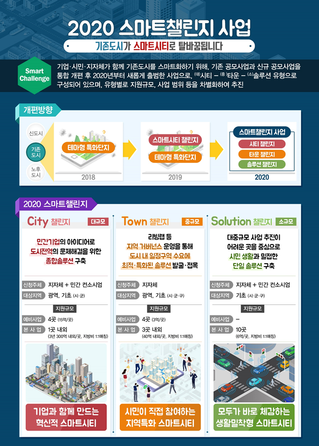 스마트 챌린지 사업2016년 미국에서 진행한 챌린지 사업에 착안해 도입한 경쟁방식의 공모사업이다. 미국에서는 교통분야로 한정하여 추진하였지만, 한국형 챌린지 사업은 교통·에너지·환경·안전 등 다양한 분야의 도시문제를 다루며, 민간 기업이 중심이 되어 지자체·시민의 수요를 반영한 창의적 아이디어를 제시하고, 새로운 스마트 솔루션 실증·확산을 위해 추진되고 있다.