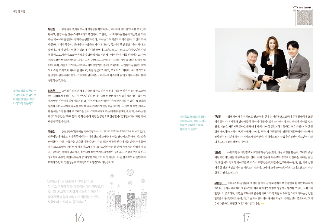 초연결과 관련된 정책가·연구원 등과의 대담을 통해 우리나라가 추진하는 초연결 사회의 현주소와 청사진, 앞으로 정책이 나아가야 할 방향을 함께 모색한다. 초연결 사회는 우리 사회를 어떻게 변화시키고 있을까? 보다 안전하고 편리한 세상을 모두가 평등하게 누리기 위해서는 어떤 정책을 준비해야 할까. 지금부터 그 궁금증을 하나씩 풀어나간다. <3월호 테마이야기 글 中>