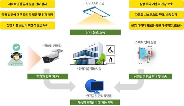 ‘스마트 클린 세이프티 존’이란 코로나19 등 확산력이 강한 전염병을 차단하기 위해 노약자, 장애인, 어린이 등이 자주 출입하는 관내 집합 시설에 무인 열화상 출입통제, UV 실내살균, 스마트 안내방송 시스템을 설치하여 공간관리 플랫폼 기반 위에서 운영되는 서비스이다.