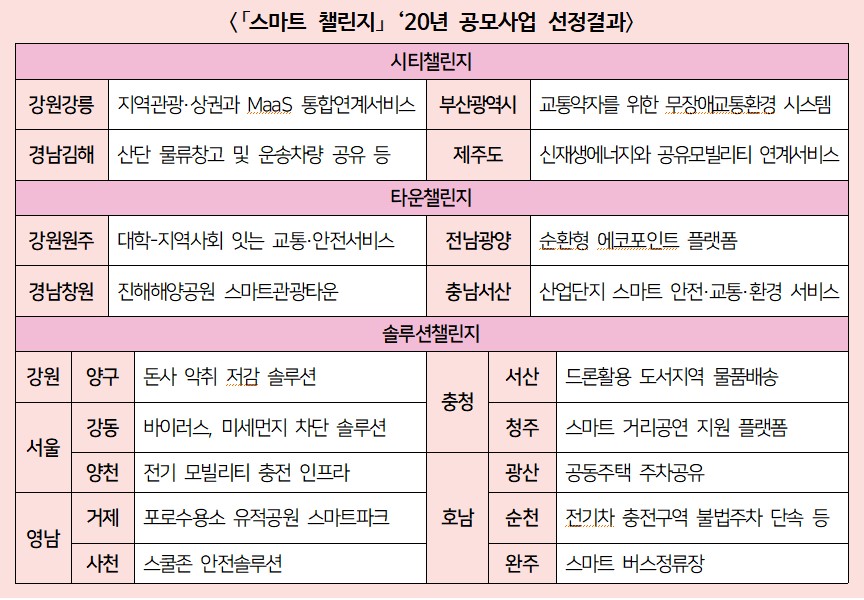국토교통부는 2020년 「스마트 챌린지」공모결과, 총 80건을접수하여 전문가 평가를 통해 18건의 과제를 지원 대상으로 선정하였다. 「스마트 챌린지」는 기업과 시민, 지자체가 힘을 모아 기존 도시에 혁신적인 기술과 창의적인 아이디어를 적용해 교통·환경·안전 등 도시문제를 해결하는 사업이다. 사업규모에 따라 시티(대), 타운(중), 솔루션(소)의 세 가지 유형으로 추진된다.