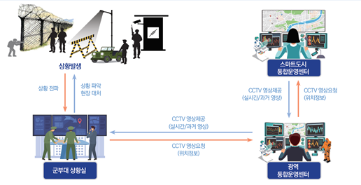 협약의 주요 내용은 군 병력을 지휘·통제하는 군부대 상황실과 지자체 스마트도시 통합운영센터* 간 연계망을 구축하고 센터의 CCTV 영상정보를 실시간 공유·활용함으로써, 군 작전 정보 분석 및 통제를 지원하고 훈련지원·재난대응 등 공조체계를 강화한다는 것이다. 국토부는 산불·홍수 등 재난사태 대응에 있어 군의 역할이 커지고 있는 만큼 이번 협약을 통해 스마트시티 통합플랫폼이 국가안보 뿐만 아니라 지역사회 안전에도 크게 기여할 수 있을 것으로 기대된다고 밝혔다.