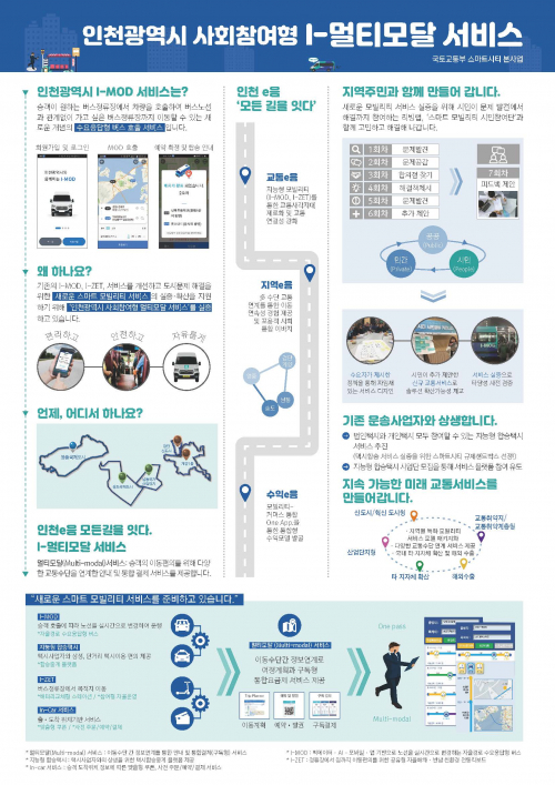 ○ 인천시는 민간의 주도로 신기술을 활용한 도시문제 해결형 비즈니스 모델을 발굴하고, 실증・확산을 효과적으로 지원하기 위한 『2020년 국토교통부 스마트시티 챌린지 실증사업에 선정』되어, 현대자동차 컨소시엄과 함께 기존의 I-MOD*, I-ZET** 서비스를 개선하고, 다양한 교통수단을 연계한 대중교통 여정계획 정보와 통합결제 서비스를 제공하는『인천광역시 사회참여형 I-멀티모달 서비스』구현을 위해 새로운 스마트 모빌리티 서비스를 실증하고 있다.