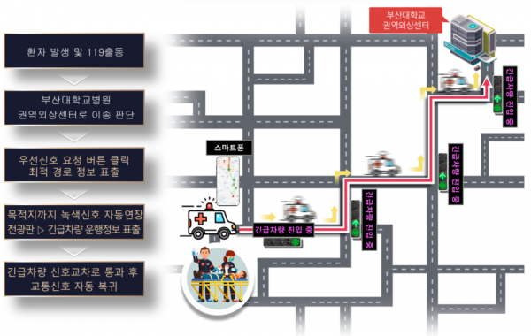 부산시는 부산대학교병원 권역외상센터 일원을 대상으로 응급환자의 골든타임 확보를 위한 ‘긴급차량 우선신호시스템’을 6월 말부터 시범 운영한다고 밝혔다.