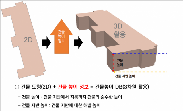 * 기존에는 건물의 층수 정보만 제공하였으나 “건물높이”와 “건물 지반 높이”를 동시에 제공함에 따라 건물이 위치한 지역의 높이를 반영 가능
