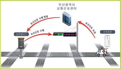 긴급차량 우선신호시스템은 긴급차량이 지나가는 경로의 신호등이 녹색으로 자동 변경되고, 주변 운전자에게는 긴급차량이 지나가고 있는 것을 알려주어 신속한 응급환자 이송을 지원해 준다. 이번 사업은 국토교통부 주관 한국형 뉴딜사업인 「지능형교통체계 구축사업」의 일환으로 부산시의 열악한 도로 여건으로 인해 긴급차량 골든타임 확보가 어려운 문제를 개선하기 위해 추진되고 있다. ![]() 인천시, 안전한 스마트 도시건설을 위한 데이터 동행 시작 2021.06.17. / 인천시