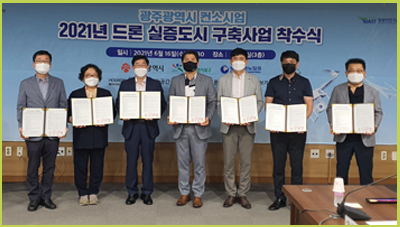 광주광역시는 16일 오전 시청 소회의실에서 ‘2021년 드론 실증도시 구축사업’ 착수식을 개최했다. 드론실증도시 구축사업은 도심 내 드론활용 활성화를 위해 세부 시험, 실증 아이템을 지역 특성에 맞게 지자체에서 제안하고 실증 및 활용을 추진하는 사업이다.