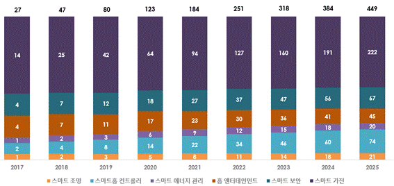 Statista는 2021년 베트남의 스마트홈 시장규모는 1억 8400만 달러에 도달 하고, 2021년부터 2025년까지 4년간 연평균 25.01% 성장하여 2025년 까지 4억 4900만 달러에 이를 것이라고 전망한다.
