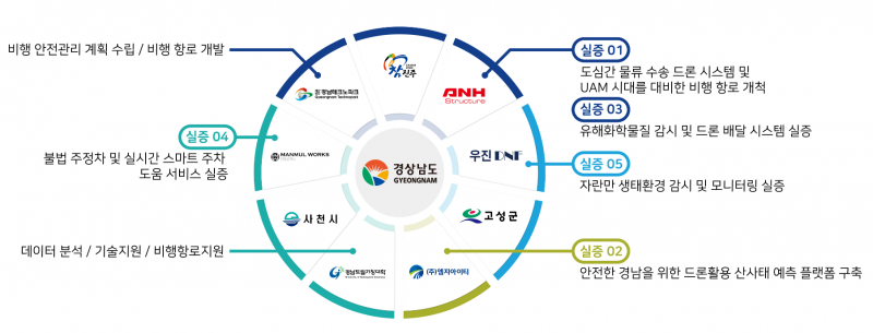 또한 참여 지자체 특성을 반영한 개별 사업도 병행할 예정이다. 진주시는 관내 기업인 anh와 함께 진주시 공공배달앱과 연계한 드론배달 서비스와 산업단지 안전 및 환경 감시 시스템 구축을 실증하고, 사천시에서는 ㈜만물공작소와 함께 불법주정차 단속 및 드론을 활용한 스마트 주차 서비스 실증을 수행한다.