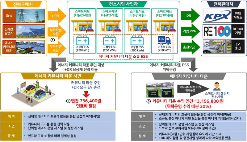 ❍ 또한, 에너지 커뮤니티 타운형 스마트허브는 불용되는 신재생 에너지를 저렴하게 구입해 에너지저장시스템(ESS)에 저장한 후 낮은 단가로 마을주민에게 전기를 공급해 에너지 비용을 절감할 계획이다.