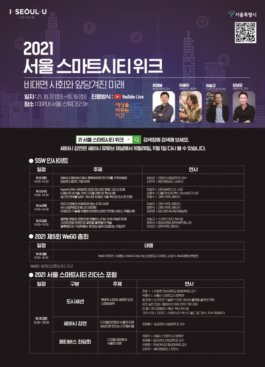 □ <서울 스마트시티 리더스포럼>은 19일(화) 오후 4시 DDP 서울온 스튜디오에서 열린다. 무관중으로 유튜브 및 공식 홈페이지를 통해 온라인 중계된다.