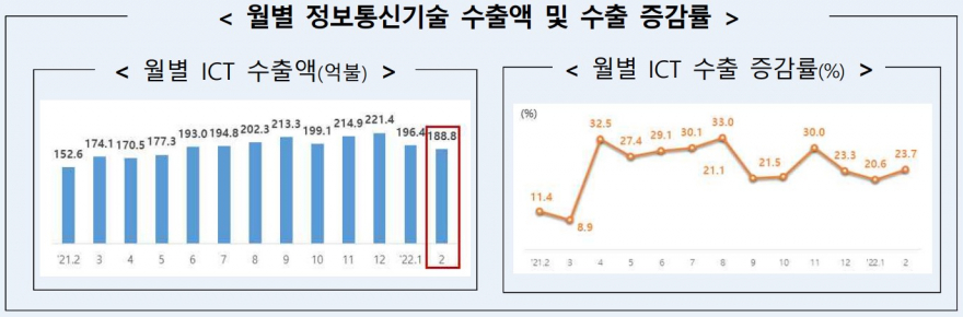 ◈ ‘22년 2월 정보통신기술(ICT) 수출 188.8억불, 수입 113.9억불,