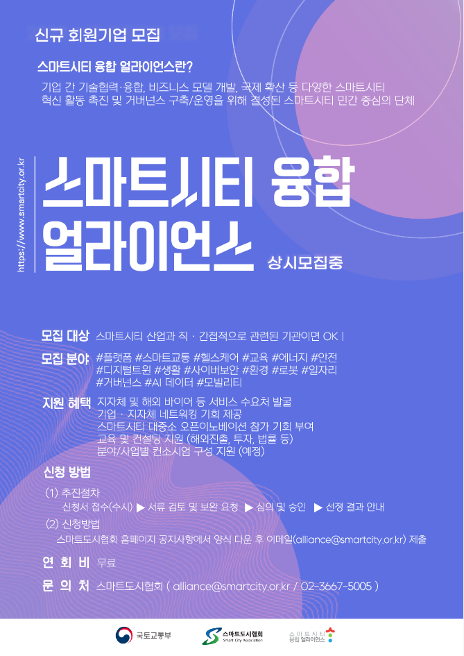 「스마트시티 융합얼라이언스 신규 회원기업」 모집공고를 다음과 같이 진행하고 있으니 많은 관심 부탁드립니다.