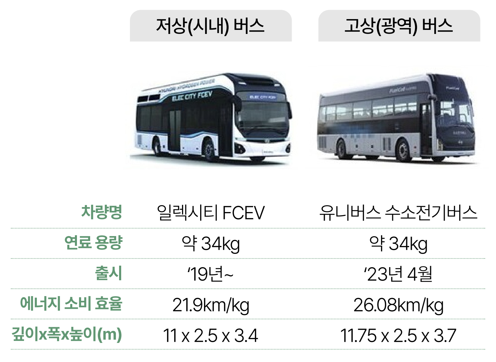 [우수기술] 수소 버스 2025-02-10T15:30:41+09:002024.12.13|우수기술| Post Views: 1,548 에너지∙환경 수소 버스는 수소로 전기를 만들어 주행하는 연료전지 시스템 기반 친환경 차량이다. 국문(KOR) 영문(ENG) 해결과제 내연기관 차량의 탄소 배출이 지구 온난화에 중요한 원인으로 작용 * 내연기관 버스는 승용차 대비 연간 약 30배의 온실가스와 약 43배의 미세먼지를 배출 수소 버스는 상용차 보급 초기 단계의 높은 가격과 충전인프라 부족 등으로 보급 부진 기대효과 내연기관 버스를 수소버스로 전환할 경우 대기오염 물질과 온실가스 감축 효과 연료의 연소 과정이 없고 에너지 손실이 적어 교통 지체구간이 많은 노선이나 장거리 운행 노선에 효율적 1년 간 운행시 이산화탄소 72톤* 감축 * 소나무 약 2,700여 그루가 1년 동안 흡수하는 이산화탄소량 주요서비스 기체수소 또는 액화수소*로 연료 충전 * 기체수소를 영하 253도씨로 냉각시켜 액체로 만들어 안전하게 대량 보관, 운송이 가능 수소연료전지 시스템을 장착하여 흡입 공기를 정화시켜 배출하므로 주행 중 대기 오염 정화 경유버스 대비 소음 약 60%, 진동은 약 40% 감소해 쾌적한 승차감 제공 주요구성 구성도 주요기술 수소 탱크 충전소에서 축압된 수소를 주입받아 저장하고 구동 시 전기발생장치로 전송 연료전지 산소/수소 공급계 탑재 및 PEM(Polymer Electrolyte Membrane: 폴리머막을 전해질로 사용) 등을 촉매제로 수소와 산소의 화학적 결합 과정에서 전기 생산 구동시스템 스택에서 발생된 전기와 고전압 배터리에서 보관된 전기를 컨버터 및 인버터로 전기를 모터로 분배 열관리시스템 냉각수 라인, 펌브, 온도감지센서 등으로 반응온도 최적화 국내 보급 수소버스 사양 도입 사례 2019년 6월, 경상남도 창원시에서 수소 버스 1호차가 등록되었으며 2024년 7월, 국내 1,000대 등록 2024년 인천광역시는 505대의 수소 버스와 액화수소 충전소를 포함한 13개소의 수소 충전소를 운영하여 수소 버스 전환 정책 선도 2024년 제주도는 그린수소 버스 11대를 투입해 2개 노선을 운영 중이며, 2030년 까지 300대까지 확대할 계획 기술기업 두산퓨얼셀 www.doosanfuelcell.com 홈페이지 브로슈어 관련영상 우진산전 www.wjis.co.kr 홈페이지 브로슈어 관련영상 현대자동차 www.hyundai.com 홈페이지 브로슈어 관련영상 목록