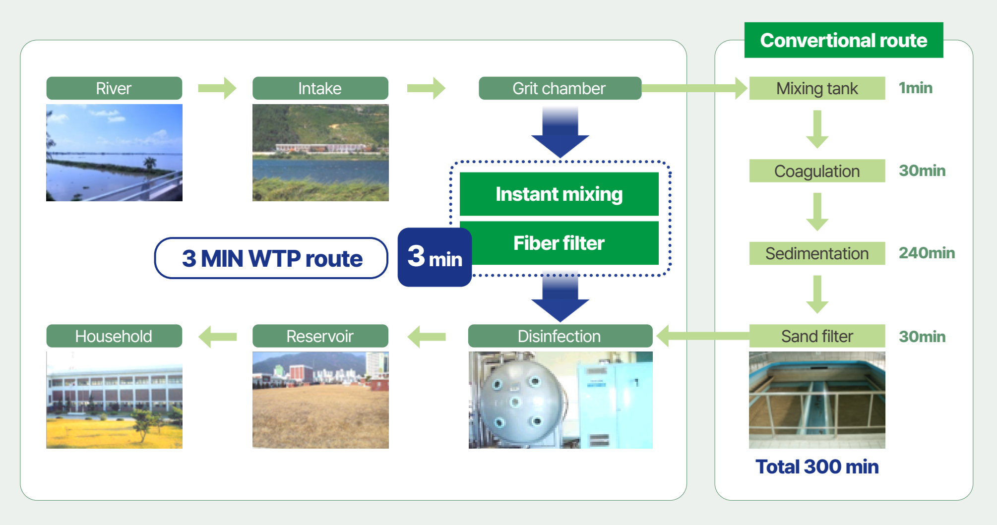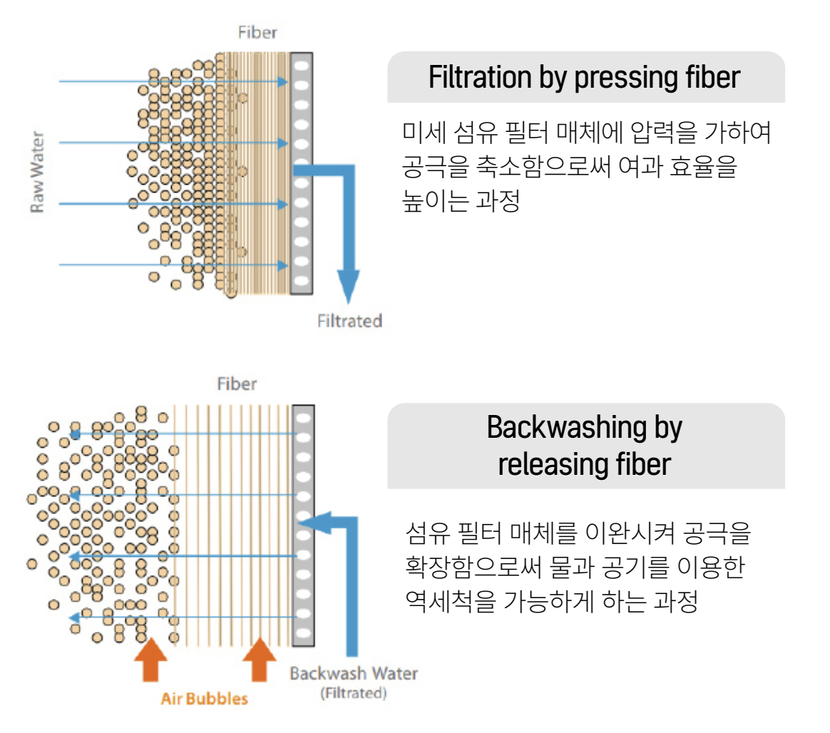 3분 스마트 정수는 섬유다발을 활용한 섬유여과기로 고탁도 유발물질, 병원성 미생물 등을 빠르고 효과적으로 여과하는 정수 기술이다.