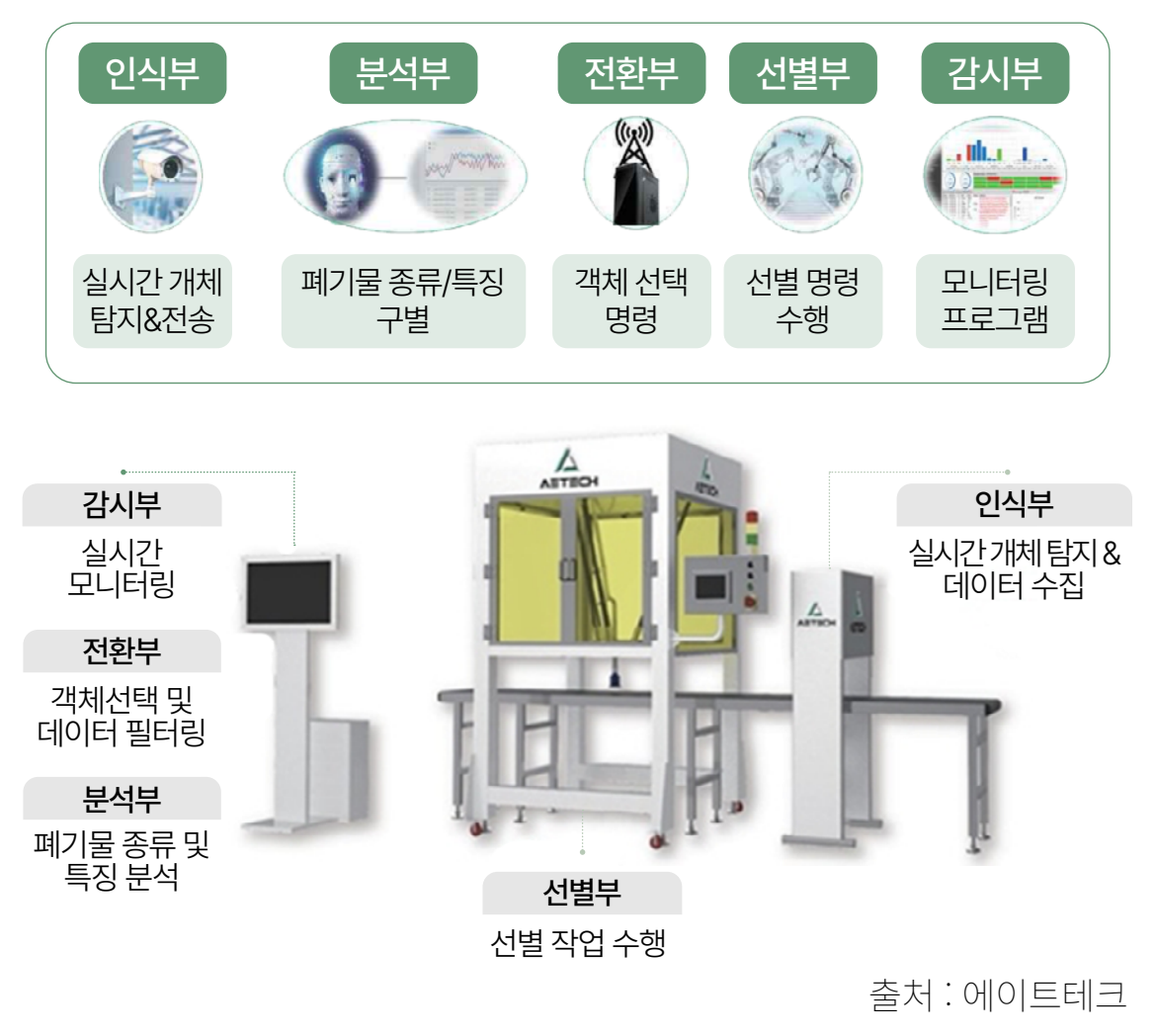 [우수기술] AI 폐기물 선별 로봇 2025-02-10T15:26:04+09:002024.12.13|우수기술| Post Views: 4,445 에너지∙환경 AI 폐기물 선별 로봇은 영상분석을 통해 폐기물 중 재활용이 가능한 자원을 선별하여 로봇팔 제어로 이송 및 분류까지 담당하는 통합 시스템을 탑재한 기술이다. 국문(KOR) 영문(ENG) 해결과제 폐기물 중 재활용품이 선별되지 못해 매립 또는 소각 처리되어 환경오염 발생 폐기물 선별장의 열악한 근무환경과 재활용품 선별 수작업으로 인한 낮은 생산성 기대효과 폐기물 매립, 소각으로 발생하는 대기, 토양, 수질 등 환경오염 저감 효율적 자원 순환 시스템 구축으로 지속가능한 순환경제에 기여 폐기물 선별에 로봇을 활용하여 선별 효율 향상 및 산업 안전 사고 감소 주요서비스 비전아이 시스템이 탑재된 카메라로 폐자원 더미에서 회수자원 인식 혼합된 폐기물 이미지에서 각 개체를 탐지하고 종류별 · 오염도별 분류 딥러닝 분석 결과 기반 및 진공흡착 방식의 로보틱스 활용하여 개체 픽킹 및 이송 운영 시스템에 작업 결과 데이터화 및 작업내용 실시간 모니터링 제어 주요구성 구성도 주요기술 딥러닝 기반 폐기물 탐지 및 분석 딥러닝 알고리즘 및 비전 카메라를 기반으로 인식한 폐자원을 재질, 색상, 특징 등을 분석하여 종류별로 식별하고 재활용 가능 여부 판별 결과 데이터 유지 알고리즘 각 개체의 결과 데이터 값을 일정 시간 유지하여 계속해서 움직이는 컨베이어에서 개체의 좌표값이 변화해도 같은 개체로 인식 객체 이송 신호 알고리즘 컨베이어벨트의 속도와 화면에 잡힌 객체가 위치한 시점을 시스템이 동기화하는 기술로 해당 시점을 신호화하여 픽킹 작업 빅데이터 실시간으로 개체 종류별, 오염도까지 모니터링하여 폐기물 빅데이터를 구축함으로써 분류 정확도 향상 스마트 선별 로봇 운영 프로세스 도입 사례 2021년~2022년 대구광역시는 데이터 기반의 시민참여형 도시문제 해결을 위해 ‘인공지능 자원순환 로봇’을 국가 물산업 클러스터 분리수거장에 설치, 오픈리빙랩 방식으로 실증 운영 2023년 제주도와 제주시는 조천항에 인공지능 재활용 도움센터(AI 폐기물 선별 로봇)를 운영, 투명‧유색 페트병, 캔류 등 6가지 재활용품 종류를 선별하고 적재량과 상태값 정보를 실시간으로 수거차량에 전달 기술기업 에이트테크 www.aetech.co.kr 홈페이지 브로슈어 관련영상 ACI www.acieconchem.com 홈페이지 브로슈어 관련영상 목록