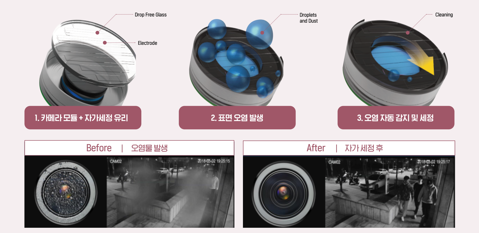 [우수기술] CCTV 전자식 자가세정 기술 2025-05-21T11:35:14+09:002024.12.13|우수기술| Post Views: 963 안전 CCTV 전자식 자가 세정 유리는 CCTV 렌즈 표면에 발생하는 다양한 오염물을 감지하고, 전기적 진동으로 제거하는 기술이다. 국문(KOR) 영문(ENG) 해결과제 빗물, 먼지 등 CCTV 카메라 렌즈 오염 시 영상 감시 불가능 CCTV 렌즈 오염에 대비한 기존 기술(와이퍼, 열선)의 문제점을 해결하는 세정기술 필요 기대효과 1초 이내 순간 세척이 가능하므로 상습 침수지역, 악천후, 폭우와 같은 환경에서도 감사 사각지대와 감시 중단 시간 없는 CCTV 영상 취득 가능 와이퍼, 열선 등 기계적, 전기적 장치 없이 동작하여 높은 내구성과 낮은 관리 비용 보장 주요서비스 다양한 산업분야에 핵심부품으로 사용되는 카메라의 커버 유리에 적용되어 렌즈 표면에 발생하는 오염물을 전기적으로 진동시켜 제거 - 카메라 렌즈가 표면의 오염을 자동으로 감지 - 전기적 진동으로 빗물과 같은 렌즈 표면의 오염물을 제거 구조가 단순하고 소모전력이 낮아 보안 카메라와 자율주행 센서 뿐만 아니라 무인 항공기 및 차량 전면 유리와 대형 건축용 유리와 같은 다양한 산업의 응용분야에 사용 가능 주요구성 구성도 주요기술 전자식 자가세정 유리(Drop Free Glass) 다중 전기 신호를 인가하여 유리 표면에 발생한 빗물과 같은 오염물을 전기적으로 가진 시켜 표면에서 제거 POINT 높은 세정효율과 빠른 세정 속도로 빗물과 기름, 꿀 등 고점도 액체 세정 가능. 추가 센서 없이 표면 오염을 자동으로 감지하여 효용성 우수 전자식 자가세정 지능형 보안카메라(AI CCTV) 전자식 자가세정 유리 기술을 적용하여 카메라 렌즈 표면에 발생한 오염물을 자동으로 감지하고 세정하는 CCTV POINT 전자식 자가세정 유리가 장착되어 오염을 세정 동작 원리 도입 사례 부산광역시 강서구는 해안가 상습 침수 및 태풍 유발 지역 내 재난안전 목적으로 도입, 실증 부산광역시 남구는 해안/하천 인근 고습도 지역의 도심지 및 산책로 내 방범 목적으로 도입, 실증 인천 송도 센트럴파크, 서울 코엑스 등에 설치하여 도심지역 방범 및 재난안전 지원에 활용 기술기업 마이크로시스템 www.microsystems.co.kr 홈페이지 브로슈어 관련영상 목록