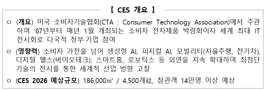 ㅇ 올해 개최되는 CES 2026의 주제는 ‘Innovators Show up(혁신가들이 나타난다)’로, AI, 첨단 모빌리티, 헬스케어(스마트홈) 등이 핵심 전시