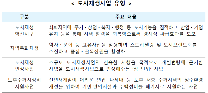 □정부가 도시재생 신규사업을 본격 추진하면서, 쇠퇴로 인해 불편했던 지방 도시가 주거와 상권, 생활 편의시설을 갖춘 공간으로 달라질 수 있는 여건이 마련된다.