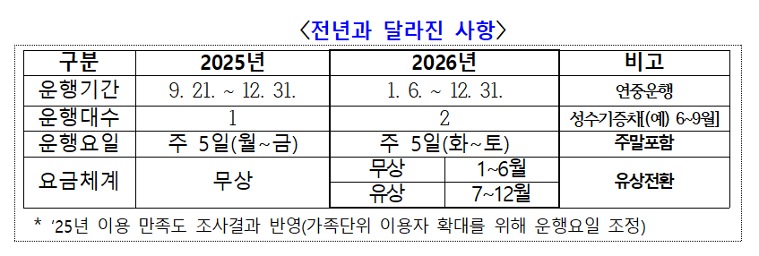 ○ 성수기에는 운행 차량을 2대로 늘려 대기 시간을 줄이고, 관광 수요를 반영해 운행 요일을 화~토요일로 조정한다. 6월까지는 무상으로 운영하다가 7월부터 유상 서비스로 전환해 지속 가능한 운영 모델을 구축할 방침이다.