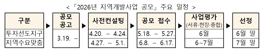 □ 공모에 관한 상세 내용은 지역개발정보시스템(rdis.or.kr)에서 확인할 수 있으며, 3월 27일 지자체 설명회를 시작으로 사전컨설팅, 서면·현장심사, 종합평가 등을 거쳐 투자선도지구는 6월말에, 지역수요맞춤지원 사업은 7월말에 각각 대상지가 선정될 예정이다.