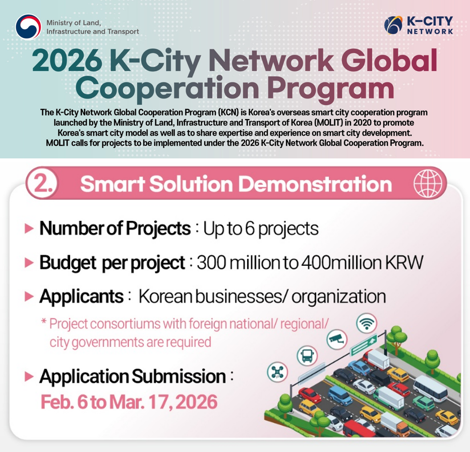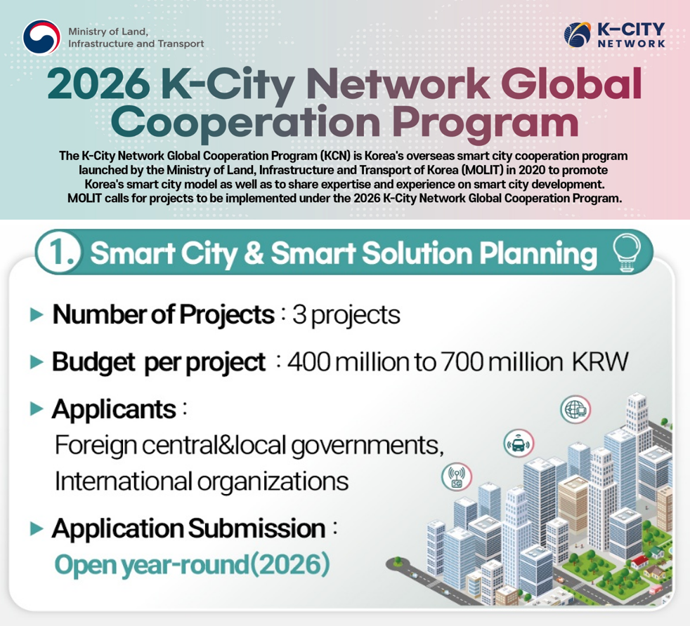 The K-City Network (KCN) is an intergovernmental smart city global cooperation program hosted by the Ministry of Land, Infrastructure, and Transport. It serves as a collaborative platform to support Korean companies' advancement into overseas smart city and urban development sectors. The Korea Overseas Infrastructure & Urban Development Corporation (KIND) will host the "2026 K-City Network Planning Project Bid Briefing Session" as follows. The session will share the 2026 project details and bidding process (proposal writing methods, evaluation results, etc.) and discuss future follow-up commercialization plans utilizing the KCN. - [...]
