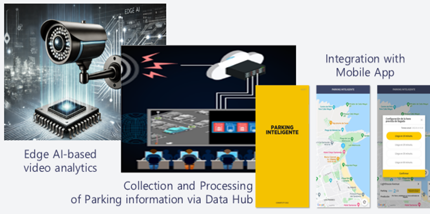 - Project Description: Real-time parking detection via Edge AI video analysis. Integrated parking demand and supply information via Data Hub connectivity. Provision of location, fee, and prediction information through mobile app.