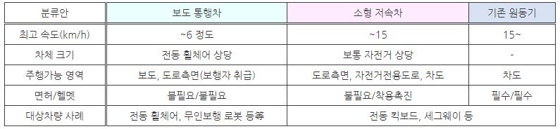 Meanwhile, according to the Japanese Road Traffic Act, vehicles are classified only as automobiles, motorbikes, and light vehicles, so the legal position of next-generation personal mobility is unclear at present. While the existing traffic laws cannot take advantage of the performance and convenience, personal mobility-related accidents are also increasing recently, so the work on reorganizing the related regulations is currently in full swing. The classification of next-generation personal mobility according to the current regulations and the classification in the new proposal currently under review are as follows.