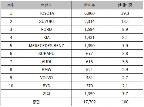 Based on total sales in '21, Toyota accounted for approximately 39% of total sales, making it the best-selling hybrid and electric vehicle brand in Colombia. In particular, six brands out of the top ten entered the rankings by three Japanese and German brands, and the other four brands were occupied by Korea, the United States, Sweden and China.