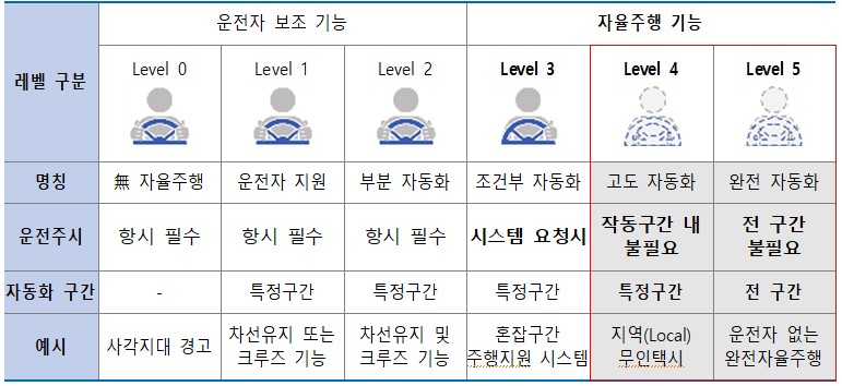 ㅇ Currently, level 3 technology for autonomous driving on expressways or car-only roads has been commercialized, but level 4 or higher autonomous driving technology is being developed and demonstrated by countries around the world.