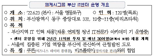 The IT center, located on the 10th and 11th floors of Meritz Tower, Dong-gu, Busan, will be used as a base in the southeast of Webcash Co., Ltd., and plans to hire more than 30 local talents every year to increase the workforce from the current 15 to 120.