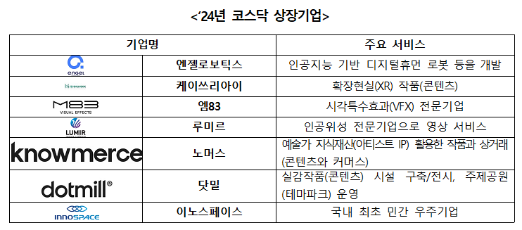 MSIT established the Digital Content Korea Fund (Digital Content Korea Fund) in 2014. Virtual Fusion World Fund(Metaverse Fund)ewwExpand and utilize the virtual fusion world (metaverse) Small and medium-sized enterprises in the field(Start-up, venture, small and medium-sized enterprise) Global Key Companyto UpbringingTo Continued investment From 2014 to 2024 Total government investment 3,665Billion won(including re-subscription) and Private investment을 통해 총 8,367A fund of hundreds of millions of dollars(fund)of FormationIt is promoting the growth of promising small and medium-sized enterprises. Through this, among existing investment companies, in 2024, 엔젤로보틱스, K3RIAI, M83 Lumir, Nomus, dot mill, Inospace Etc 7Reaper가 Performance to be listed도 attainmentI've done it.