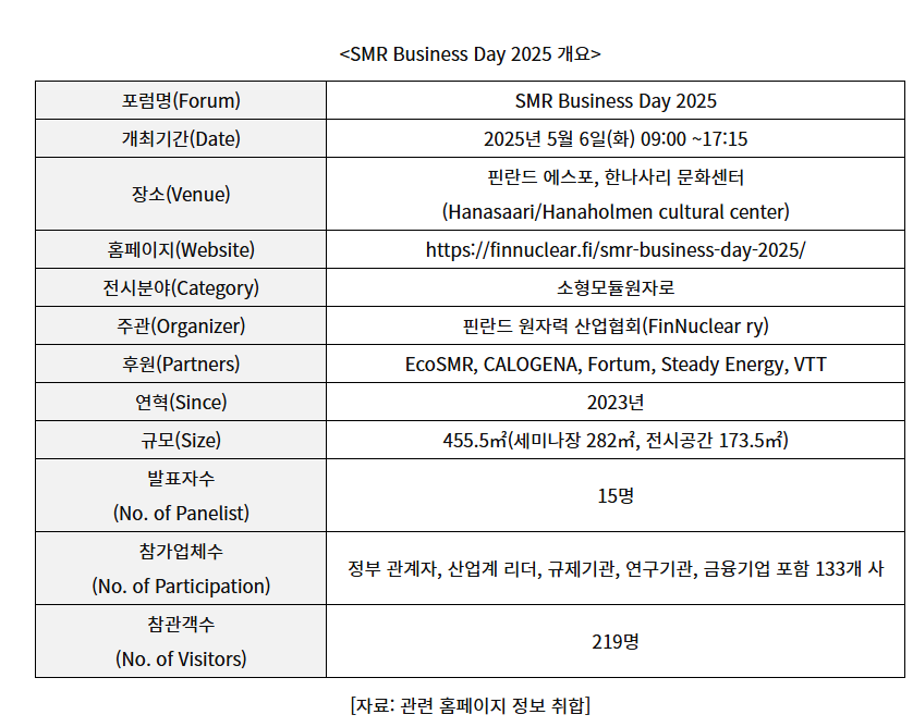 Held for the third time this year, 'SMR Business Day 3' is a business forum hosted by Finnuclear, the Finnish Nuclear Industry Association, and is an event that covers the latest technologies, markets, policies, and financial models for small modular reactors. This event was attended by about 2025 business and government officials from Finland, Norway, Denmark, Sweden, Estonia, and other neighboring countries, as well as the US, France, the UK, Germany, the Czech Republic, and Japan, and shared their opinions. The main discussion was on strengthening cooperation in terms of policy, technology, and investment to promote practical commercialization of SMR technology.