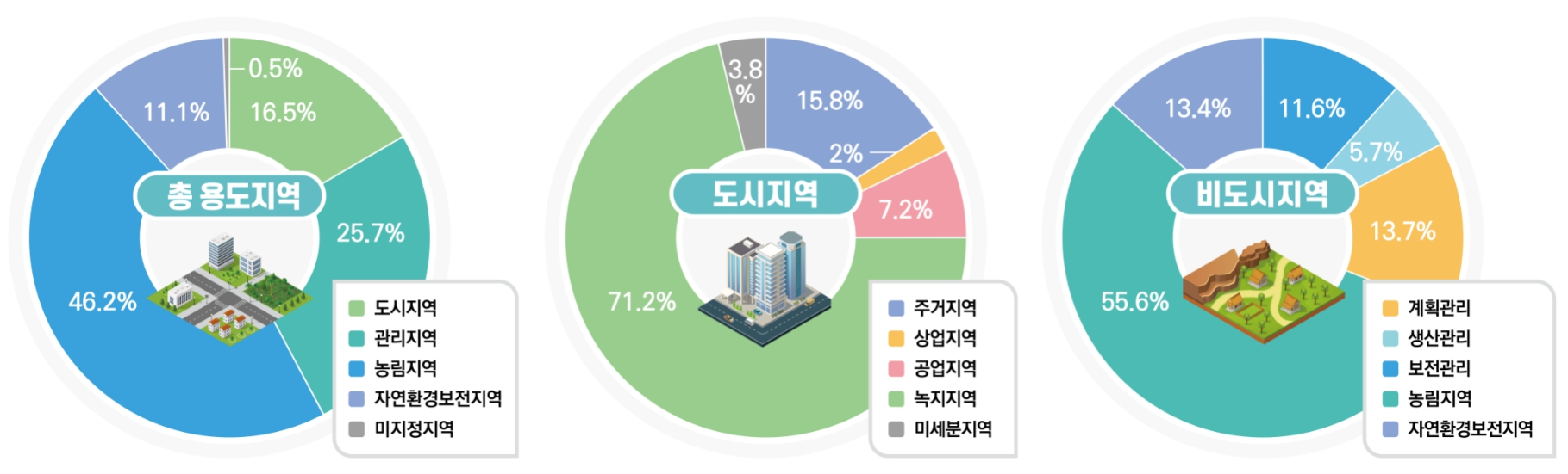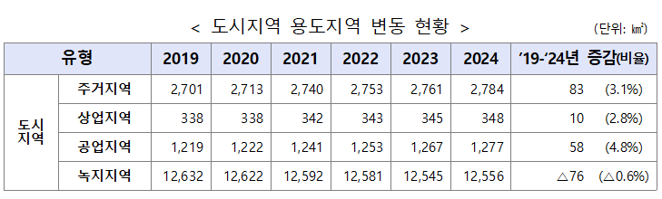 ㅇ Compared to 19, residential areas in urban areas increased by 83㎢ (↑3.1%), commercial areas increased by 10㎢ (↑2.8%), and industrial areas increased by 58㎢ (↑4.8%), while green areas decreased slightly (76㎢, ↓0.6%).
