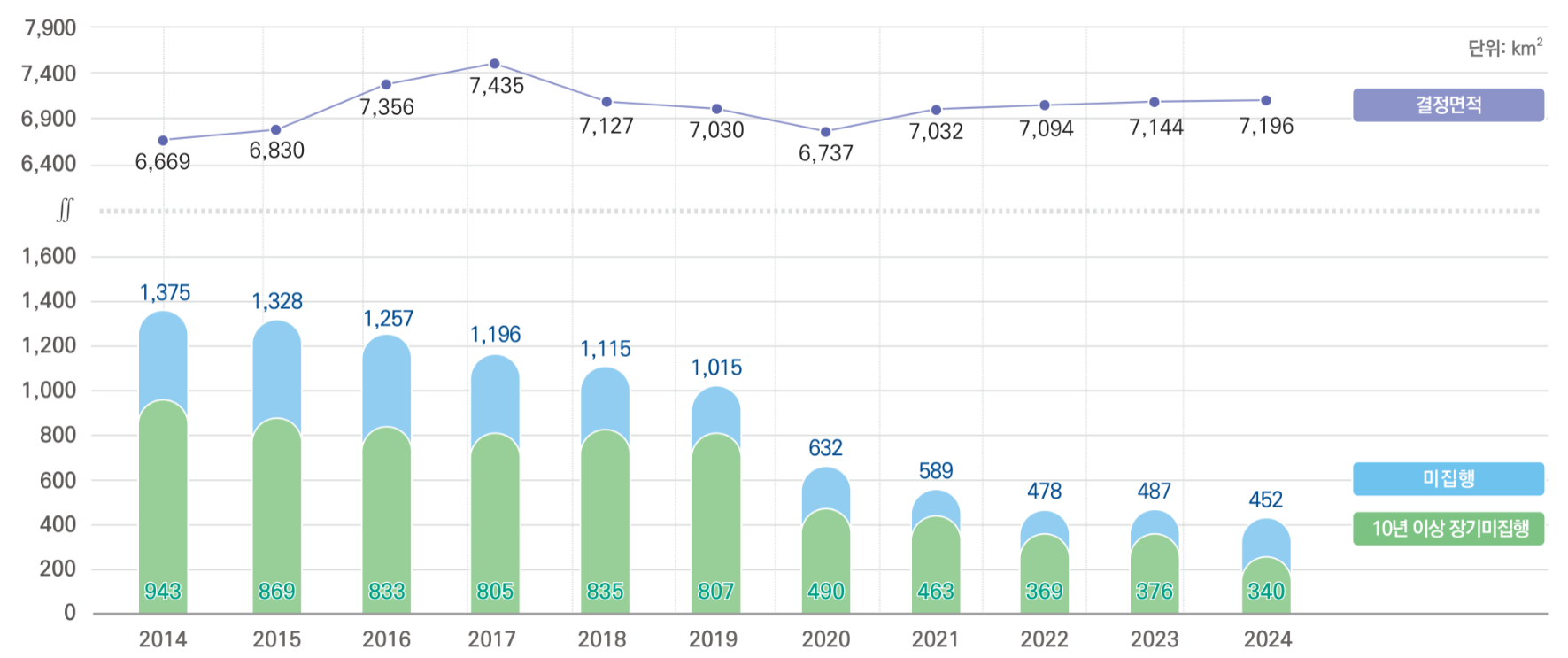 ㅇ Land compensation, etc. has not been provided for more than 10 years Long-term non-execution city-military planning facilityIn 14, it was 943㎢ '24년 340㎢로 63.9%(603㎢) decreasedid.