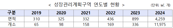 ㅇ Introduced in 14 to prevent overdevelopment in non-urbanized areas* Growth Management Plan Area은 '24년 11,975place, 4,259㎢로 Aggregationdone.
