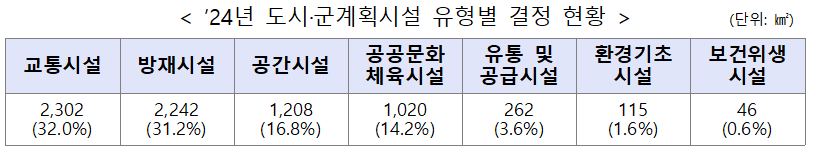 - If you look at it by area, it includes roads, railways, etc. Transportation facilitiesThis is the largest at 2,302㎢ (32.0%), and rivers and reservoirs, etc. Disaster Prevention Facility 2,242㎢ (31.2%), parks, green spaces, plazas, etc. Space facilities It appeared in the order of 1,208㎢ (16.8%).