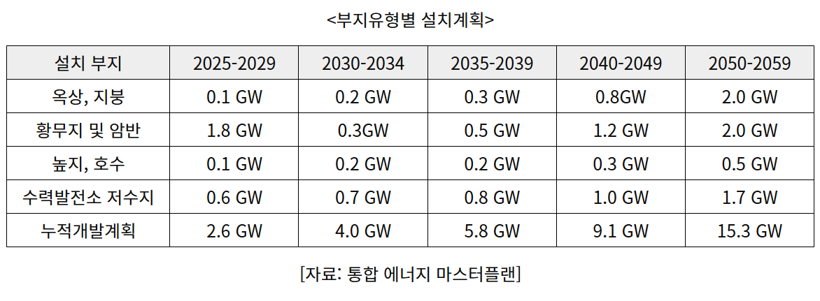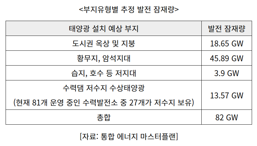 The 2025 Master Plan study estimates that the total solar power generation potential of 82 GW could be installed on a variety of land types, including industrial and residential sites in urban areas, flat and gently sloping areas in wasteland or rocky areas, and unused wetlands, lakes, and swamps.