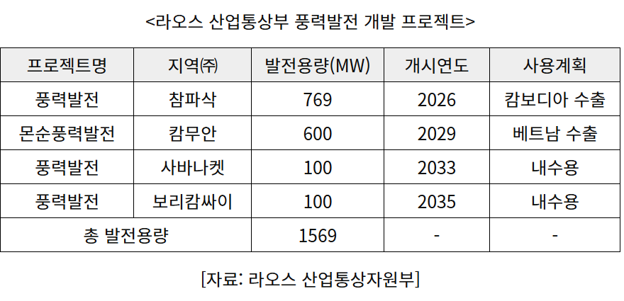 Source: Compilation of data from KOTRA Vientiane Trade Center, including the Lao Ministry of Trade, Industry and Energy, Integrated Energy Master Plan, Global Wind Atlas, and Global Solar Atlas.