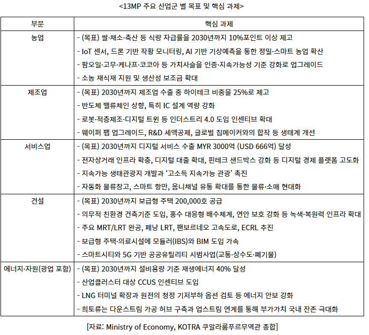 (Manufacturing and electrical and electronics industries) The manufacturing sector is expected to perform better than in the 12MP era, fueled by the NIMP 2030 initiative. In particular, the upscaling of the semiconductor value chain and the establishment of an integrated circuit (IC) design hub centered in Penang and Selangor are identified as key drivers. Beyond semiconductors, chemicals, pharmaceuticals, and medical devices are also identified as emerging growth engines.